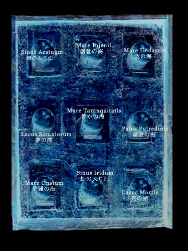 | 月の石標本(The stone specimen of the moon) マッシモ=A=ドルトフスキ(1898-1950)の小説『月星』にインスパイアされて製作した作品。 『月星』は全9章からの構成になっており、イタリアの天文学者リチオリによって名付けられた月 の地名が各章のタイトルとして冠されている。またその月の地名が物語の重要な鍵となり、物語に 重厚な趣を与えているのは周知の事実である。 |